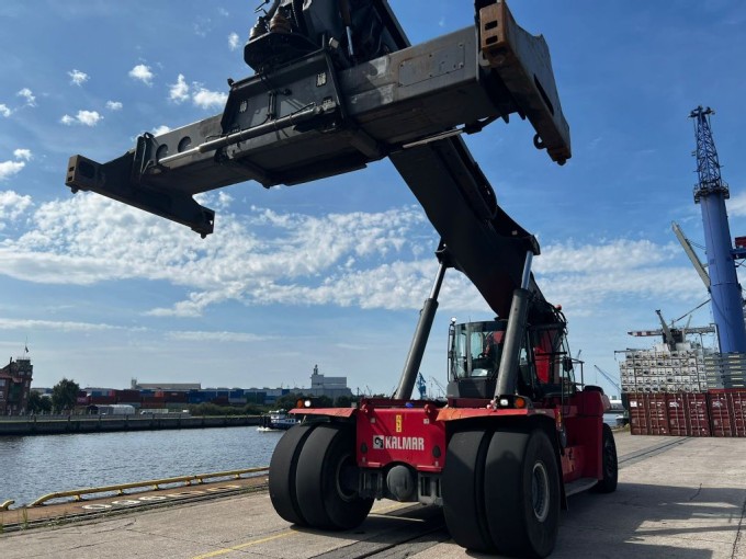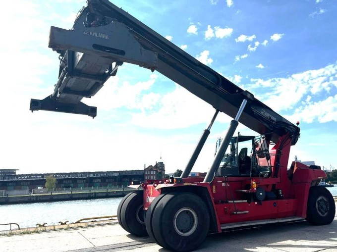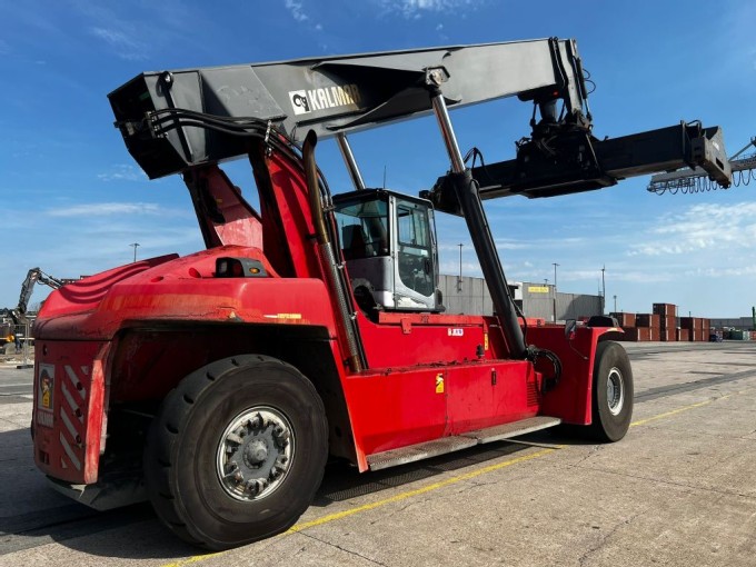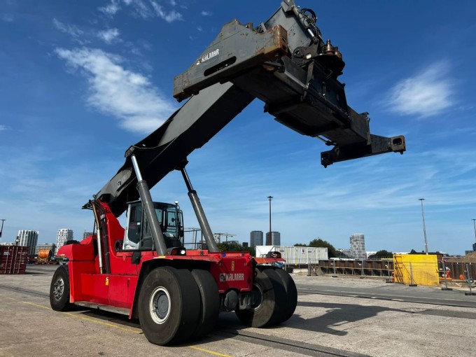 Kalmar DRG450-60S5 reachstacker available for container terminal operations and heavy-duty lifting tasks in port environments. Equipped with a Volvo engine, telescopic mast, and 45T lifting capacity, this 2016 unit is fully operational and ready for deployment.