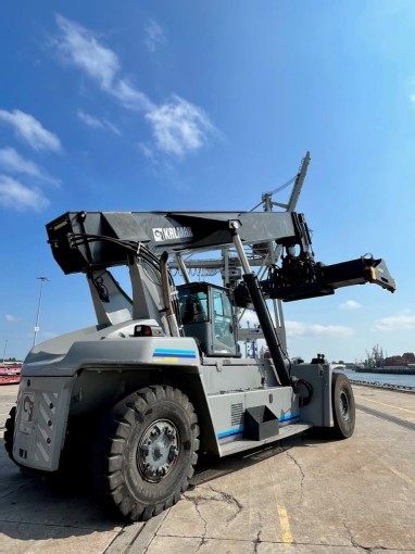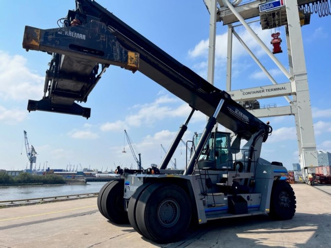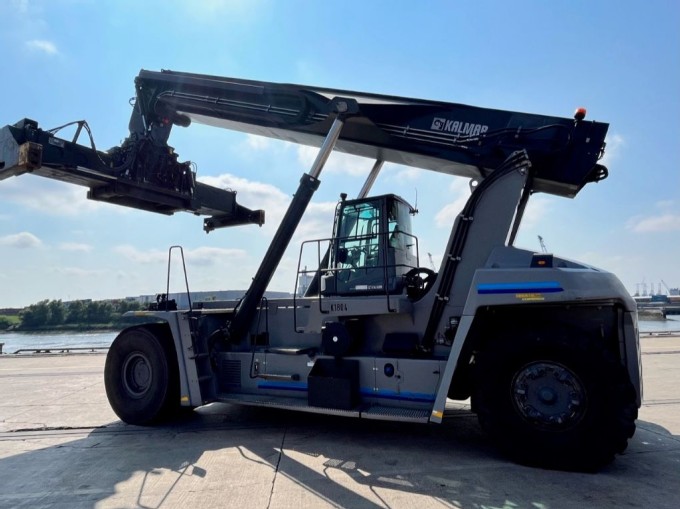 Kalmar DRG450-60S5 reachstacker available for container terminal operations and heavy-duty lifting tasks in port environments. Equipped with a Volvo diesel engine, telescopic mast, and 45T lifting capacity, this 2018 unit is fully operational and ready for deployment.