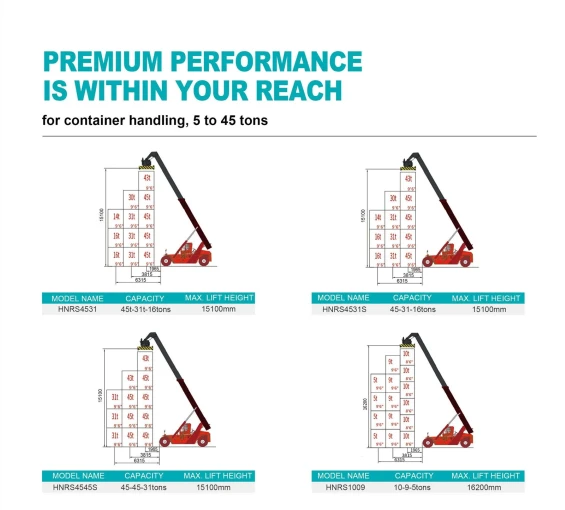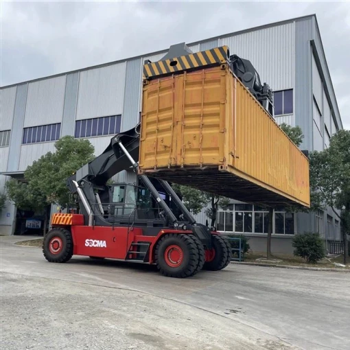 SOCMA HNR5455S reachstacker built for intensive port operations and high stacking requirements. Equipped with robust diesel engine (Volvo/Cummins) and heavy-duty J450 spreader for handling loaded containers up to 45 tons. Optimized for 3-row container stacking, with ergonomic cabin, load-sensing hydraulics, and 9700 mm turning radius for tight terminal spaces.