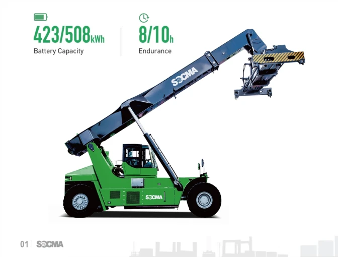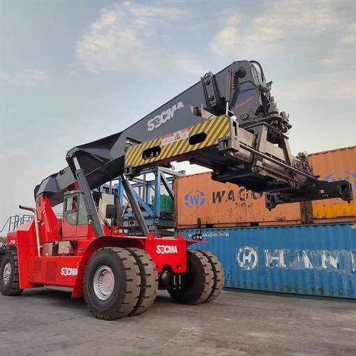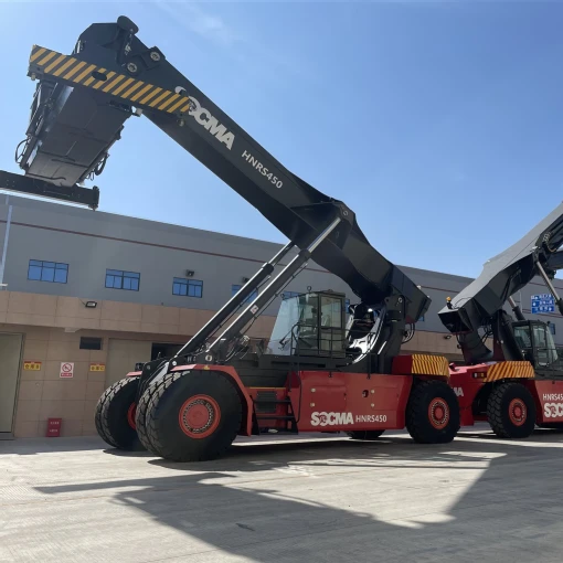 Fully-electric 45T reachstacker designed for terminal operations. This SOCMA HNRS4531-5E model combines long endurance (up to 10 hours), advanced remote diagnostics, safety tech, and ergonomic cabin controls. Built for daily port and intermodal use with intelligent systems for battery, stability, and efficient container handling.