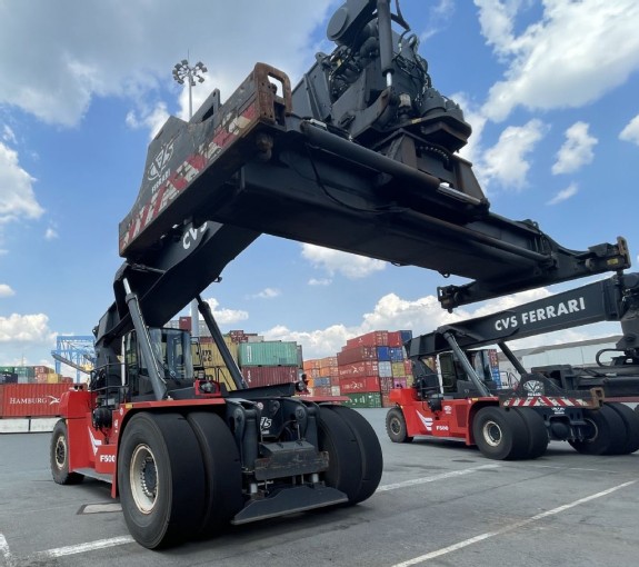 CVS Ferrari F500RS6 S, full container reachstacker, 46t capacity, Scania DC13 engine, Dana TE32FF transmission, hydraulic sliding cabin, automatic spreader adjustment, port handling equipment, Hamburg Germany.