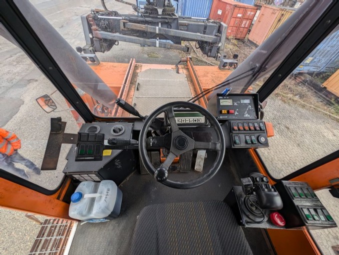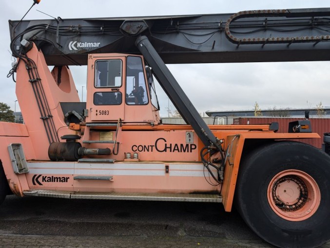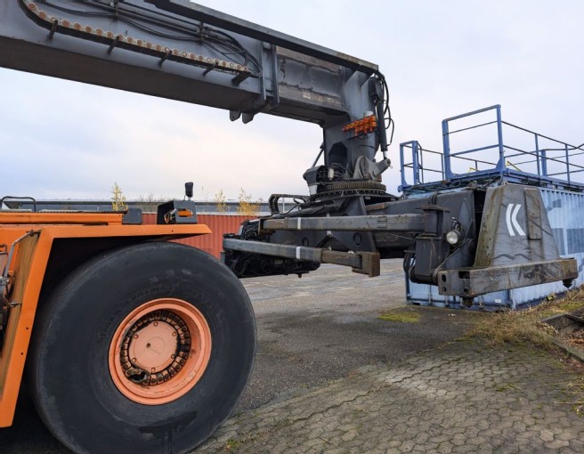 Kalmar DC4560RC4, full container reachstacker, 45t lifting capacity, Volvo TD100G engine, piggy-back spreader, hydraulic sliding cabin, reverse camera, port equipment, Hamburg Germany.